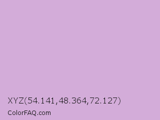 XYZ 54.141,48.364,72.127 Color is a light magenta color and the nearest color is Pink Lavender #d8b2d1. Hex code #d3acd9 and RGB value is rgb(211,172,217). In RGB color space, this color is composed of 83% red, 67% green, 85% blue, In CMYK color space, this color is composed of 3% cyan, 21% magenta, 0% yellow , 15% black , In HSL color space, this color has a hue angle of 292° , 37% saturation and 76% lightness.