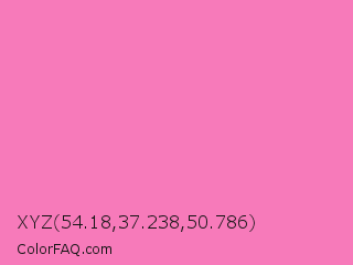 XYZ 54.18,37.238,50.786 Color is a light rose color and the nearest color is Persian Pink #f77fbe. Hex code #f77aba and RGB value is rgb(247,122,186). In RGB color space, this color is composed of 97% red, 48% green, 73% blue, In CMYK color space, this color is composed of 0% cyan, 51% magenta, 25% yellow , 3% black , In HSL color space, this color has a hue angle of 329° , 89% saturation and 72% lightness.