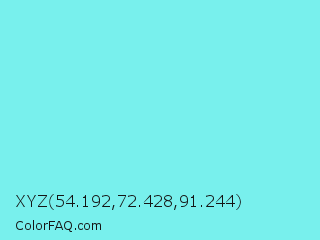 XYZ 54.192,72.428,91.244 Color is a light cyan color and the nearest color is Spray #79deec. Hex code #78f0ed and RGB value is rgb(120,240,237). In RGB color space, this color is composed of 47% red, 94% green, 93% blue, In CMYK color space, this color is composed of 50% cyan, 0% magenta, 1% yellow , 6% black , In HSL color space, this color has a hue angle of 179° , 80% saturation and 71% lightness.