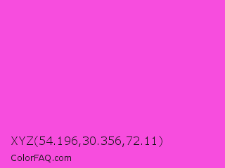 XYZ 54.196,30.356,72.11 Color is a light magenta color and the nearest color is Purple Pizzazz #fe4eda. Hex code #f74dde and RGB value is rgb(247,77,222). In RGB color space, this color is composed of 97% red, 30% green, 87% blue, In CMYK color space, this color is composed of 0% cyan, 69% magenta, 10% yellow , 3% black , In HSL color space, this color has a hue angle of 309° , 91% saturation and 64% lightness.