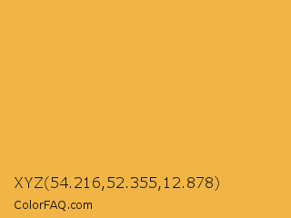 XYZ 54.216,52.355,12.878 Color is a light orange color and the nearest color is Maximum Yellow Red #f2ba49. Hex code #f2b545 and RGB value is rgb(242,181,69). In RGB color space, this color is composed of 95% red, 71% green, 27% blue, In CMYK color space, this color is composed of 0% cyan, 25% magenta, 71% yellow , 5% black , In HSL color space, this color has a hue angle of 39° , 87% saturation and 61% lightness.