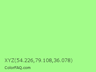 XYZ 54.226,79.108,36.078 Color is a light green color and the nearest color is Pale Green #98fb98. Hex code #a2fc89 and RGB value is rgb(162,252,137). In RGB color space, this color is composed of 64% red, 99% green, 54% blue, In CMYK color space, this color is composed of 36% cyan, 0% magenta, 46% yellow , 1% black , In HSL color space, this color has a hue angle of 107° , 95% saturation and 76% lightness.