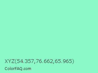 XYZ 54.357,76.662,65.965 Color is a light green color and the nearest color is Aquamarine #7fffd4. Hex code #8af8c7 and RGB value is rgb(138,248,199). In RGB color space, this color is composed of 54% red, 97% green, 78% blue, In CMYK color space, this color is composed of 44% cyan, 0% magenta, 20% yellow , 3% black , In HSL color space, this color has a hue angle of 153° , 89% saturation and 76% lightness.