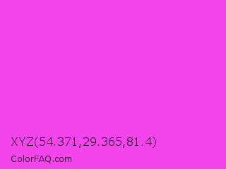 XYZ 54.371,29.365,81.4 Color is a light magenta color and the nearest color is Purple Pizzazz #fe4eda. Hex code #f444eb and RGB value is rgb(244,68,235). In RGB color space, this color is composed of 96% red, 27% green, 92% blue, In CMYK color space, this color is composed of 0% cyan, 72% magenta, 4% yellow , 4% black , In HSL color space, this color has a hue angle of 303° , 89% saturation and 61% lightness.