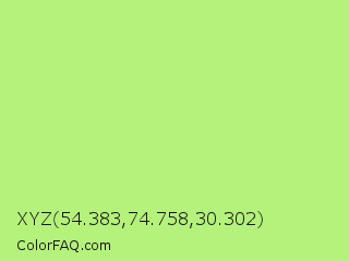 XYZ 54.383,74.758,30.302 Color is a light green color and the nearest color is Sulu #c1f07c. Hex code #b5f27b and RGB value is rgb(181,242,123). In RGB color space, this color is composed of 71% red, 95% green, 48% blue, In CMYK color space, this color is composed of 25% cyan, 0% magenta, 49% yellow , 5% black , In HSL color space, this color has a hue angle of 91° , 82% saturation and 72% lightness.