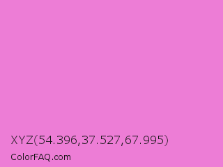 XYZ 54.396,37.527,67.995 Color is a light magenta color and the nearest color is Pale Magenta #f984e5. Hex code #ed7dd6 and RGB value is rgb(237,125,214). In RGB color space, this color is composed of 93% red, 49% green, 84% blue, In CMYK color space, this color is composed of 0% cyan, 47% magenta, 10% yellow , 7% black , In HSL color space, this color has a hue angle of 312° , 76% saturation and 71% lightness.
