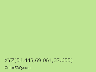 XYZ 54.443,69.061,37.655 Color is a light green color and the nearest color is Medium Spring Bud #c9dc87. Hex code #bee592 and RGB value is rgb(190,229,146). In RGB color space, this color is composed of 75% red, 90% green, 57% blue, In CMYK color space, this color is composed of 17% cyan, 0% magenta, 36% yellow , 10% black , In HSL color space, this color has a hue angle of 88° , 61% saturation and 74% lightness.