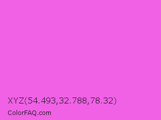 XYZ 54.493,32.788,78.32 Color is a light magenta color and the nearest color is Purple Pizzazz #fe4eda. Hex code #f061e6 and RGB value is rgb(240,97,230). In RGB color space, this color is composed of 94% red, 38% green, 90% blue, In CMYK color space, this color is composed of 0% cyan, 60% magenta, 4% yellow , 6% black , In HSL color space, this color has a hue angle of 304° , 83% saturation and 66% lightness.
