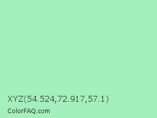 XYZ 54.524,72.917,57.1 Color is a light green color and the nearest color is Chinook #a8e3bd. Hex code #a2efb9 and RGB value is rgb(162,239,185). In RGB color space, this color is composed of 64% red, 94% green, 73% blue, In CMYK color space, this color is composed of 32% cyan, 0% magenta, 23% yellow , 6% black , In HSL color space, this color has a hue angle of 138° , 71% saturation and 79% lightness.