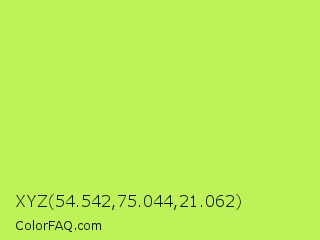 XYZ 54.542,75.044,21.062 Color is a light green color and the nearest color is Inchworm #b2ec5d. Hex code #bdf259 and RGB value is rgb(189,242,89). In RGB color space, this color is composed of 74% red, 95% green, 35% blue, In CMYK color space, this color is composed of 22% cyan, 0% magenta, 63% yellow , 5% black , In HSL color space, this color has a hue angle of 81° , 85% saturation and 65% lightness.