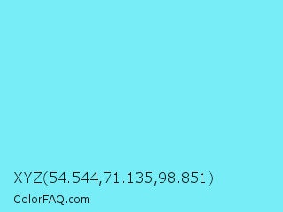 XYZ 54.544,71.135,98.851 Color is a light cyan color and the nearest color is Electric Blue #7df9ff. Hex code #76edf7 and RGB value is rgb(118,237,247). In RGB color space, this color is composed of 46% red, 93% green, 97% blue, In CMYK color space, this color is composed of 52% cyan, 4% magenta, 0% yellow , 3% black , In HSL color space, this color has a hue angle of 185° , 89% saturation and 72% lightness.