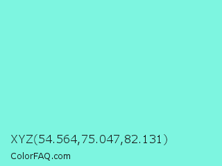 XYZ 54.564,75.047,82.131 Color is a light cyan color and the nearest color is Aquamarine #7fffd4. Hex code #7df5e0 and RGB value is rgb(125,245,224). In RGB color space, this color is composed of 49% red, 96% green, 88% blue, In CMYK color space, this color is composed of 49% cyan, 0% magenta, 9% yellow , 4% black , In HSL color space, this color has a hue angle of 170° , 86% saturation and 73% lightness.