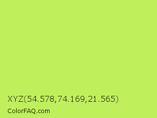 XYZ 54.578,74.169,21.565 Color is a light green color and the nearest color is Inchworm #b2ec5d. Hex code #bff05c and RGB value is rgb(191,240,92). In RGB color space, this color is composed of 75% red, 94% green, 36% blue, In CMYK color space, this color is composed of 20% cyan, 0% magenta, 62% yellow , 6% black , In HSL color space, this color has a hue angle of 80° , 83% saturation and 65% lightness.