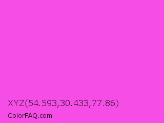 XYZ 54.593,30.433,77.86 Color is a light magenta color and the nearest color is Purple Pizzazz #fe4eda. Hex code #f54de6 and RGB value is rgb(245,77,230). In RGB color space, this color is composed of 96% red, 30% green, 90% blue, In CMYK color space, this color is composed of 0% cyan, 69% magenta, 6% yellow , 4% black , In HSL color space, this color has a hue angle of 305° , 89% saturation and 63% lightness.