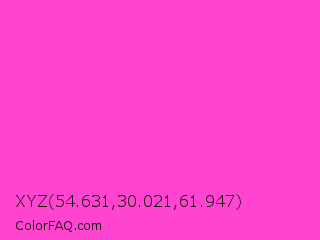 XYZ 54.631,30.021,61.947 Color is a light magenta color and the nearest color is Purple Pizzazz #fe4eda. Hex code #ff45cf and RGB value is rgb(255,69,207). In RGB color space, this color is composed of 100% red, 27% green, 81% blue, In CMYK color space, this color is composed of 0% cyan, 73% magenta, 19% yellow , 0% black , In HSL color space, this color has a hue angle of 315° , 100% saturation and 64% lightness.