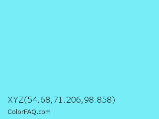 XYZ 54.68,71.206,98.858 Color is a light cyan color and the nearest color is Electric Blue #7df9ff. Hex code #77edf7 and RGB value is rgb(119,237,247). In RGB color space, this color is composed of 47% red, 93% green, 97% blue, In CMYK color space, this color is composed of 52% cyan, 4% magenta, 0% yellow , 3% black , In HSL color space, this color has a hue angle of 185° , 89% saturation and 72% lightness.