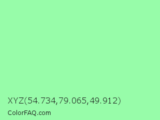 XYZ 54.734,79.065,49.912 Color is a light green color and the nearest color is Pale Green #98fb98. Hex code #97fca9 and RGB value is rgb(151,252,169). In RGB color space, this color is composed of 59% red, 99% green, 66% blue, In CMYK color space, this color is composed of 40% cyan, 0% magenta, 33% yellow , 1% black , In HSL color space, this color has a hue angle of 131° , 94% saturation and 79% lightness.