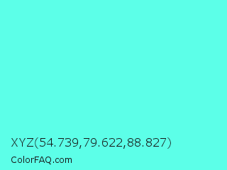 XYZ 54.739,79.622,88.827 Color is a light cyan color and the nearest color is Aquamarine #7fffd4. Hex code #5cffe8 and RGB value is rgb(92,255,232). In RGB color space, this color is composed of 36% red, 100% green, 91% blue, In CMYK color space, this color is composed of 64% cyan, 0% magenta, 9% yellow , 0% black , In HSL color space, this color has a hue angle of 172° , 100% saturation and 68% lightness.