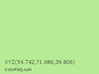 XYZ 54.742,71.686,39.806 Color is a light green color and the nearest color is Granny Smith Apple #a8e4a0. Hex code #b7eb96 and RGB value is rgb(183,235,150). In RGB color space, this color is composed of 72% red, 92% green, 59% blue, In CMYK color space, this color is composed of 22% cyan, 0% magenta, 36% yellow , 8% black , In HSL color space, this color has a hue angle of 97° , 68% saturation and 75% lightness.