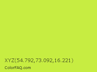 XYZ 54.792,73.092,16.221 Color is a normal lime color and the nearest color is Pear #d1e231. Hex code #c7ed41 and RGB value is rgb(199,237,65). In RGB color space, this color is composed of 78% red, 93% green, 25% blue, In CMYK color space, this color is composed of 16% cyan, 0% magenta, 73% yellow , 7% black , In HSL color space, this color has a hue angle of 73° , 83% saturation and 59% lightness.