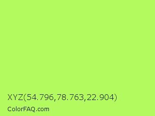 XYZ 54.796,78.763,22.904 Color is a light green color and the nearest color is Inchworm #b2ec5d. Hex code #b3fa5e and RGB value is rgb(179,250,94). In RGB color space, this color is composed of 70% red, 98% green, 37% blue, In CMYK color space, this color is composed of 28% cyan, 0% magenta, 62% yellow , 2% black , In HSL color space, this color has a hue angle of 87° , 94% saturation and 67% lightness.