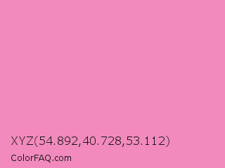 XYZ 54.892,40.728,53.112 Color is a light rose color and the nearest color is Persian Pink #f77fbe. Hex code #f28abd and RGB value is rgb(242,138,189). In RGB color space, this color is composed of 95% red, 54% green, 74% blue, In CMYK color space, this color is composed of 0% cyan, 43% magenta, 22% yellow , 5% black , In HSL color space, this color has a hue angle of 331° , 80% saturation and 75% lightness.