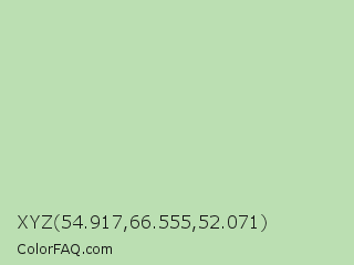 XYZ 54.917,66.555,52.071 Color is a light green color and the nearest color is Pixie Green #c0d8b6. Hex code #bbdfb2 and RGB value is rgb(187,223,178). In RGB color space, this color is composed of 73% red, 87% green, 70% blue, In CMYK color space, this color is composed of 16% cyan, 0% magenta, 20% yellow , 13% black , In HSL color space, this color has a hue angle of 108° , 41% saturation and 79% lightness.
