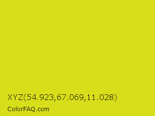 XYZ 54.923,67.069,11.028 Color is a normal yellow color and the nearest color is Barberry #ded717. Hex code #d9de1a and RGB value is rgb(217,222,26). In RGB color space, this color is composed of 85% red, 87% green, 10% blue, In CMYK color space, this color is composed of 2% cyan, 0% magenta, 88% yellow , 13% black , In HSL color space, this color has a hue angle of 62° , 79% saturation and 49% lightness.