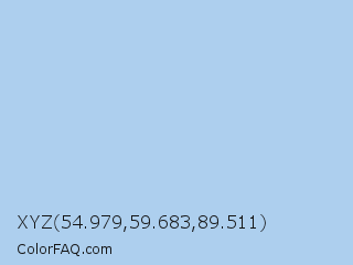 XYZ 54.979,59.683,89.511 Color is a very light blue color and the nearest color is Pale Cornflower Blue #abcdef. Hex code #adcfee and RGB value is rgb(173,207,238). In RGB color space, this color is composed of 68% red, 81% green, 93% blue, In CMYK color space, this color is composed of 27% cyan, 13% magenta, 0% yellow , 7% black , In HSL color space, this color has a hue angle of 209° , 66% saturation and 81% lightness.