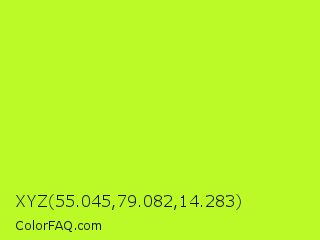 XYZ 55.045,79.082,14.283 Color is a normal lime color and the nearest color is Green Yellow #adff2f. Hex code #bbfa27 and RGB value is rgb(187,250,39). In RGB color space, this color is composed of 73% red, 98% green, 15% blue, In CMYK color space, this color is composed of 25% cyan, 0% magenta, 84% yellow , 2% black , In HSL color space, this color has a hue angle of 78° , 95% saturation and 57% lightness.