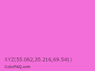 XYZ 55.062,35.216,69.541 Color is a light magenta color and the nearest color is Rose Pink #ff66cc. Hex code #f36ed9 and RGB value is rgb(243,110,217). In RGB color space, this color is composed of 95% red, 43% green, 85% blue, In CMYK color space, this color is composed of 0% cyan, 55% magenta, 11% yellow , 5% black , In HSL color space, this color has a hue angle of 312° , 85% saturation and 69% lightness.