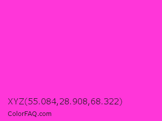 XYZ 55.084,28.908,68.322 Color is a light magenta color and the nearest color is Razzle Dazzle Rose #ff33cc. Hex code #ff36d9 and RGB value is rgb(255,54,217). In RGB color space, this color is composed of 100% red, 21% green, 85% blue, In CMYK color space, this color is composed of 0% cyan, 79% magenta, 15% yellow , 0% black , In HSL color space, this color has a hue angle of 311° , 100% saturation and 61% lightness.