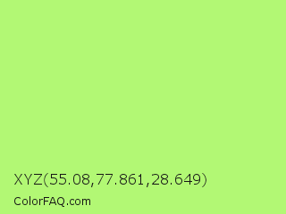 XYZ 55.08,77.861,28.649 Color is a light green color and the nearest color is Sulu #c1f07c. Hex code #b2f874 and RGB value is rgb(178,248,116). In RGB color space, this color is composed of 70% red, 97% green, 45% blue, In CMYK color space, this color is composed of 28% cyan, 0% magenta, 53% yellow , 3% black , In HSL color space, this color has a hue angle of 92° , 90% saturation and 71% lightness.