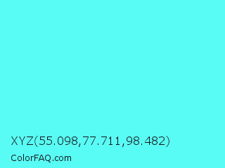 XYZ 55.098,77.711,98.482 Color is a light cyan color and the nearest color is Electric Blue #7df9ff. Hex code #59fbf5 and RGB value is rgb(89,251,245). In RGB color space, this color is composed of 35% red, 98% green, 96% blue, In CMYK color space, this color is composed of 65% cyan, 0% magenta, 2% yellow , 2% black , In HSL color space, this color has a hue angle of 178° , 95% saturation and 67% lightness.