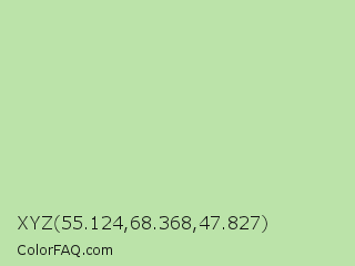 XYZ 55.124,68.368,47.827 Color is a light green color and the nearest color is Moss Green #addfad. Hex code #bbe3a9 and RGB value is rgb(187,227,169). In RGB color space, this color is composed of 73% red, 89% green, 66% blue, In CMYK color space, this color is composed of 18% cyan, 0% magenta, 26% yellow , 11% black , In HSL color space, this color has a hue angle of 101° , 51% saturation and 78% lightness.