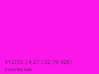 XYZ 55.14,27.152,79.426 Color is a normal magenta color and the nearest color is Hot Magenta #ff1dce. Hex code #fc16e9 and RGB value is rgb(252,22,233). In RGB color space, this color is composed of 99% red, 9% green, 91% blue, In CMYK color space, this color is composed of 0% cyan, 91% magenta, 8% yellow , 1% black , In HSL color space, this color has a hue angle of 305° , 97% saturation and 54% lightness.