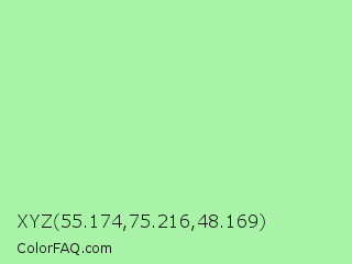XYZ 55.174,75.216,48.169 Color is a light green color and the nearest color is Granny Smith Apple #a8e4a0. Hex code #a8f3a7 and RGB value is rgb(168,243,167). In RGB color space, this color is composed of 66% red, 95% green, 65% blue, In CMYK color space, this color is composed of 31% cyan, 0% magenta, 31% yellow , 5% black , In HSL color space, this color has a hue angle of 119° , 76% saturation and 80% lightness.