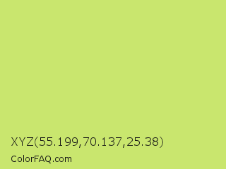 XYZ 55.199,70.137,25.38 Color is a light lime color and the nearest color is Yellow Green #c5e17a. Hex code #c9e66e and RGB value is rgb(201,230,110). In RGB color space, this color is composed of 79% red, 90% green, 43% blue, In CMYK color space, this color is composed of 13% cyan, 0% magenta, 52% yellow , 10% black , In HSL color space, this color has a hue angle of 75° , 71% saturation and 67% lightness.