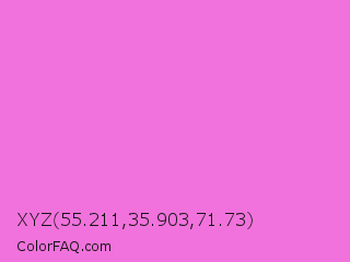 XYZ 55.211,35.903,71.73 Color is a light magenta color and the nearest color is Pale Magenta #f984e5. Hex code #f172dc and RGB value is rgb(241,114,220). In RGB color space, this color is composed of 95% red, 45% green, 86% blue, In CMYK color space, this color is composed of 0% cyan, 53% magenta, 9% yellow , 5% black , In HSL color space, this color has a hue angle of 310° , 82% saturation and 70% lightness.