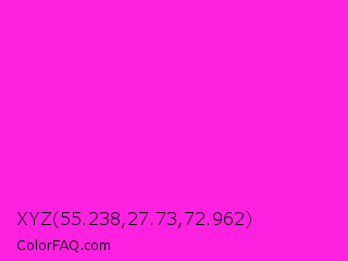 XYZ 55.238,27.73,72.962 Color is a normal magenta color and the nearest color is Hot Magenta #ff1dce. Hex code #ff21e0 and RGB value is rgb(255,33,224). In RGB color space, this color is composed of 100% red, 13% green, 88% blue, In CMYK color space, this color is composed of 0% cyan, 87% magenta, 12% yellow , 0% black , In HSL color space, this color has a hue angle of 308° , 100% saturation and 56% lightness.