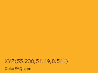 XYZ 55.238,51.49,8.541 Color is a normal orange color and the nearest color is My Sin #ffb31f. Hex code #fab022 and RGB value is rgb(250,176,34). In RGB color space, this color is composed of 98% red, 69% green, 13% blue, In CMYK color space, this color is composed of 0% cyan, 30% magenta, 86% yellow , 2% black , In HSL color space, this color has a hue angle of 39° , 96% saturation and 56% lightness.
