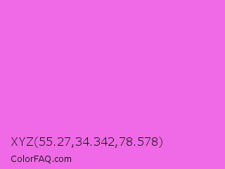 XYZ 55.27,34.342,78.578 Color is a light magenta color and the nearest color is Lavender Magenta #ee82ee. Hex code #f069e6 and RGB value is rgb(240,105,230). In RGB color space, this color is composed of 94% red, 41% green, 90% blue, In CMYK color space, this color is composed of 0% cyan, 56% magenta, 4% yellow , 6% black , In HSL color space, this color has a hue angle of 304° , 82% saturation and 68% lightness.