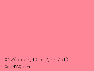 XYZ 55.27,40.512,33.761 Color is a light red color and the nearest color is Tulip #ff878d. Hex code #ff8696 and RGB value is rgb(255,134,150). In RGB color space, this color is composed of 100% red, 53% green, 59% blue, In CMYK color space, this color is composed of 0% cyan, 47% magenta, 41% yellow , 0% black , In HSL color space, this color has a hue angle of 352° , 100% saturation and 76% lightness.