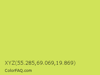 XYZ 55.285,69.069,19.869 Color is a light yellow color and the nearest color is Maximum Green Yellow #d9e650. Hex code #d0e359 and RGB value is rgb(208,227,89). In RGB color space, this color is composed of 82% red, 89% green, 35% blue, In CMYK color space, this color is composed of 8% cyan, 0% magenta, 61% yellow , 11% black , In HSL color space, this color has a hue angle of 68° , 71% saturation and 62% lightness.
