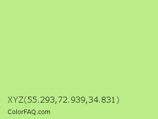 XYZ 55.293,72.939,34.831 Color is a light green color and the nearest color is Sulu #c1f07c. Hex code #bbed89 and RGB value is rgb(187,237,137). In RGB color space, this color is composed of 73% red, 93% green, 54% blue, In CMYK color space, this color is composed of 21% cyan, 0% magenta, 42% yellow , 7% black , In HSL color space, this color has a hue angle of 90° , 74% saturation and 73% lightness.