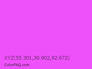XYZ 55.301,30.902,92.672 Color is a light magenta color and the nearest color is Pink Flamingo Crayola #ff66ff. Hex code #ee51f9 and RGB value is rgb(238,81,249). In RGB color space, this color is composed of 93% red, 32% green, 98% blue, In CMYK color space, this color is composed of 4% cyan, 67% magenta, 0% yellow , 2% black , In HSL color space, this color has a hue angle of 296° , 93% saturation and 65% lightness.