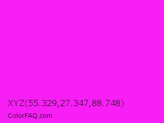 XYZ 55.329,27.347,88.748 Color is a normal magenta color and the nearest color is Magenta / Fuchsia #ff00ff. Hex code #f71ff5 and RGB value is rgb(247,31,245). In RGB color space, this color is composed of 97% red, 12% green, 96% blue, In CMYK color space, this color is composed of 0% cyan, 87% magenta, 1% yellow , 3% black , In HSL color space, this color has a hue angle of 301° , 93% saturation and 55% lightness.