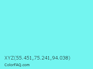 XYZ 55.451,75.241,94.038 Color is a light cyan color and the nearest color is Electric Blue #7df9ff. Hex code #73f5f0 and RGB value is rgb(115,245,240). In RGB color space, this color is composed of 45% red, 96% green, 94% blue, In CMYK color space, this color is composed of 53% cyan, 0% magenta, 2% yellow , 4% black , In HSL color space, this color has a hue angle of 178° , 87% saturation and 71% lightness.