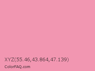XYZ 55.46,43.864,47.139 Color is a light rose color and the nearest color is Wewak #f19bab. Hex code #f296b1 and RGB value is rgb(242,150,177). In RGB color space, this color is composed of 95% red, 59% green, 69% blue, In CMYK color space, this color is composed of 0% cyan, 38% magenta, 27% yellow , 5% black , In HSL color space, this color has a hue angle of 342° , 78% saturation and 77% lightness.