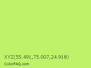 XYZ 55.491,75.007,24.918 Color is a light green color and the nearest color is Inchworm #b2ec5d. Hex code #bff169 and RGB value is rgb(191,241,105). In RGB color space, this color is composed of 75% red, 95% green, 41% blue, In CMYK color space, this color is composed of 21% cyan, 0% magenta, 56% yellow , 5% black , In HSL color space, this color has a hue angle of 82° , 83% saturation and 68% lightness.